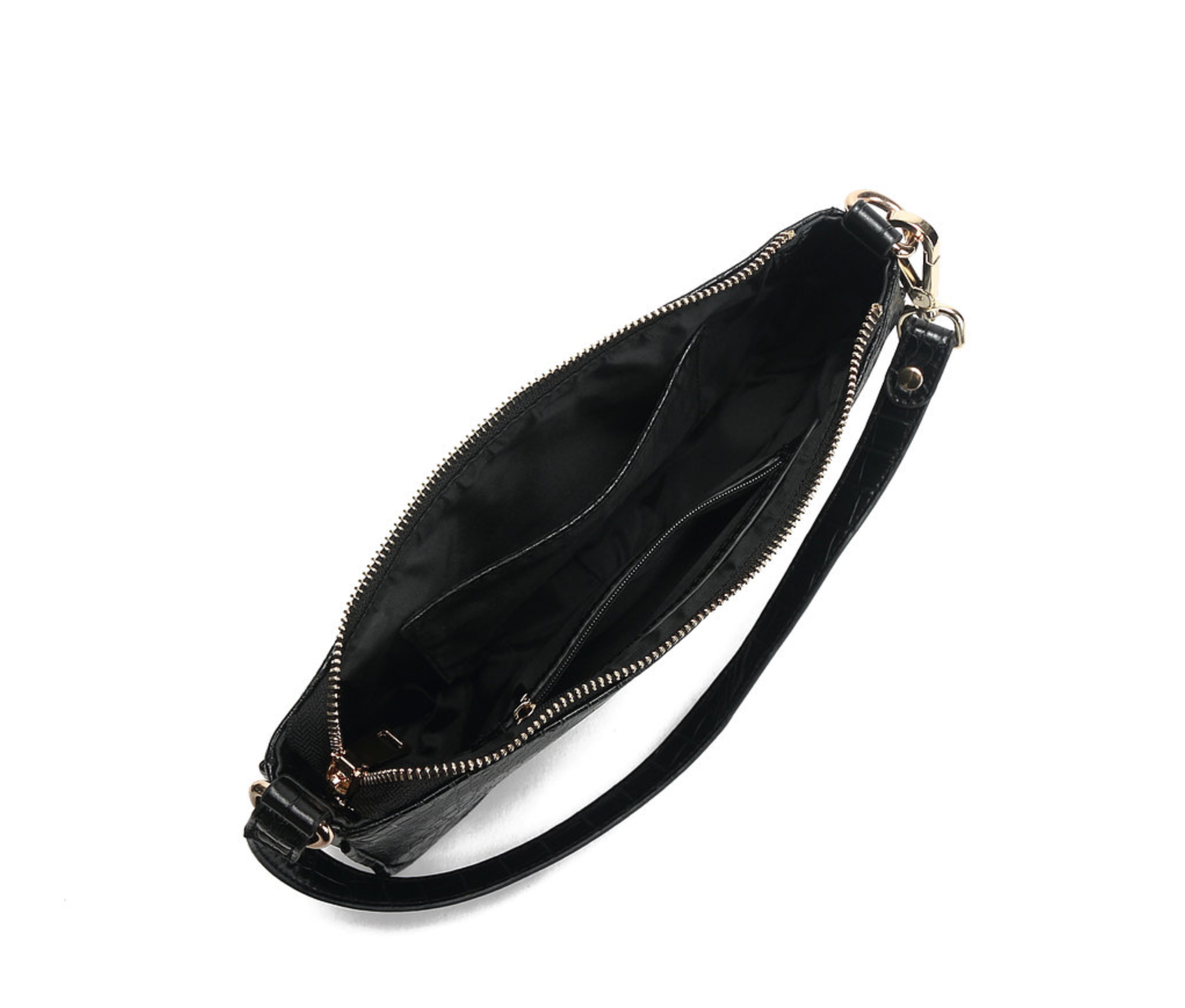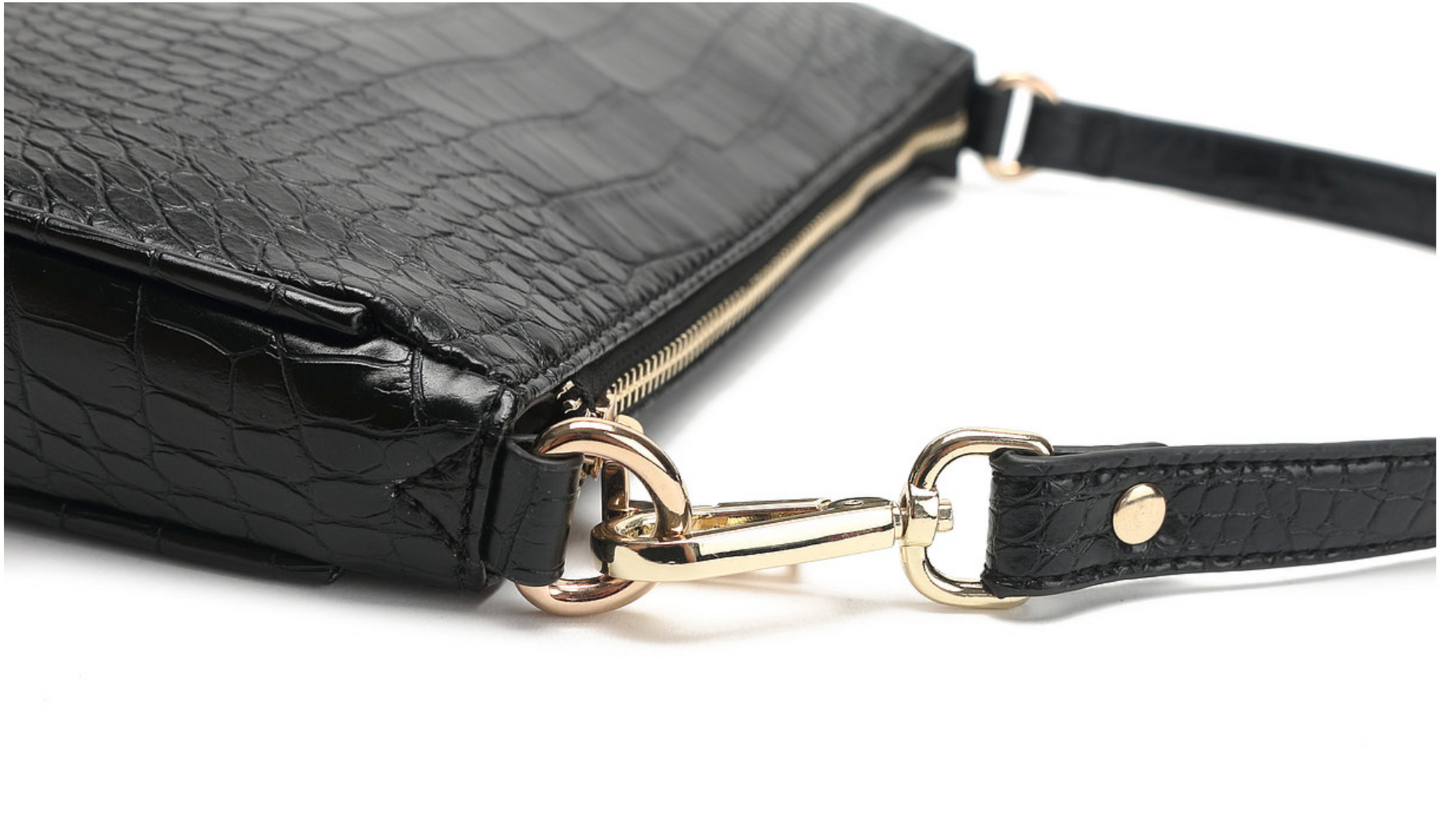 Simple and chic everyday shoulder bag made with sustainable materials. Recycled Polyurethane crocodile effect with top zip fastening.